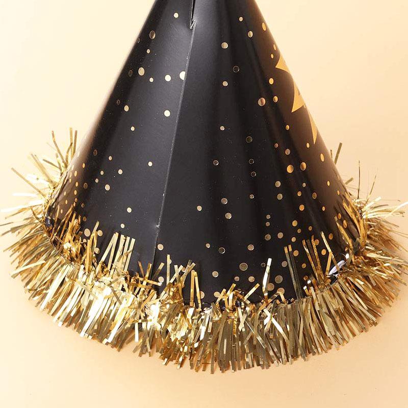 Mũ tiệc Tết 2024 - mũ trang trí đen vàng với tua rua và pompom màu sắc, lý tưởng cho sinh nhật và sự kiện. Có sẵn để bán sỉ.
